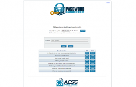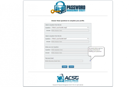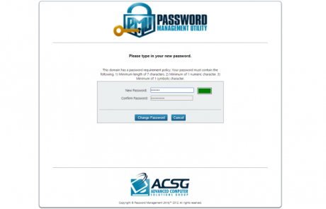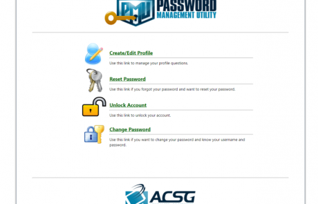 The ACSG Password Management Utility (PMU) is a secure, cloud based, self-service password management portal. Its purpose is to allow individual end users to handle common issues related to their passwords without the need for time consuming IT calls. A user can autonomously reset their password, change their password and or unlock their account even after business hours! Our service works by connecting to your Active Directory over a secure SSL connection that is only allowed from our servers through your firewall. The authentication is passed in real-time over a secure channel and is NEVER stored in a database.